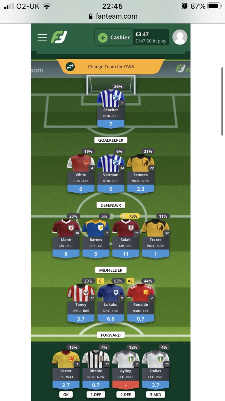 Fanteam decent progress here (considering only 37k players) up 9.5k to 10.5k. I entered 4 teams so am still hoping to turn a profit. Still have WC and like in fpl no immediate plans to use it. Again I have traore so he will be going.