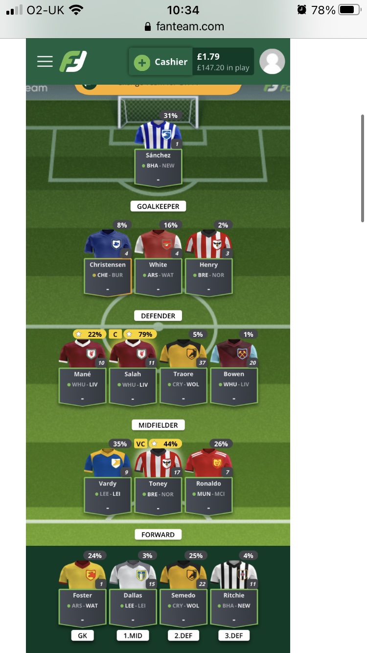 Fanteam- here I have seen my biggest drop – down 4.5k to 15k. Again traore needs to go with my free transfer. No major issues.